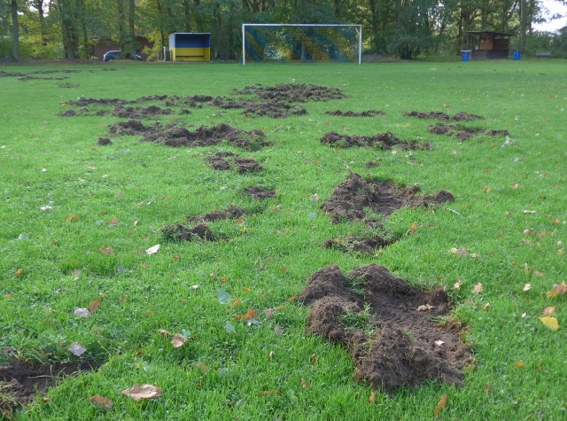 In der Nacht zum 3. Oktober verwüstete eine Rotte Wildschweine unseren Sportplatz und eine Fläche hinter dem Sportheim. Die Bespielbarkeit des Platzes ist so nicht mehr möglich. In einer ad-hoc-Aktion einiger Vereinsmitglieder konnten die gröbsten Schäden bereinigt werden. Aber es ist unumgänglich, die Unebenheiten auszugleichen, um Unfälle zu vermeiden. In einem Arbeitseinsatz am Samstag, 5. Oktober um 11 Uhr wollen wir das tun.